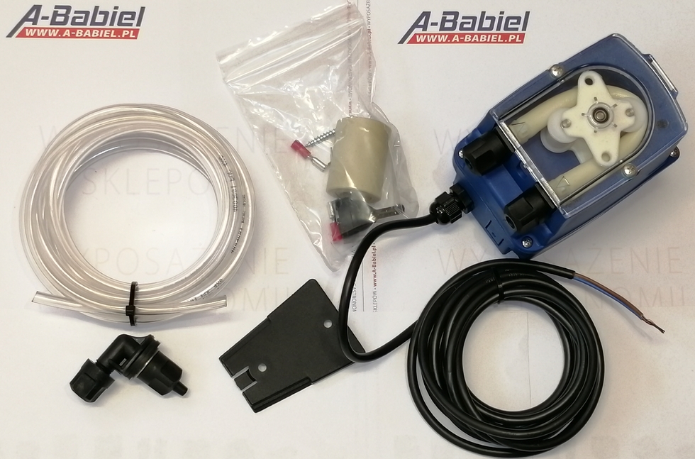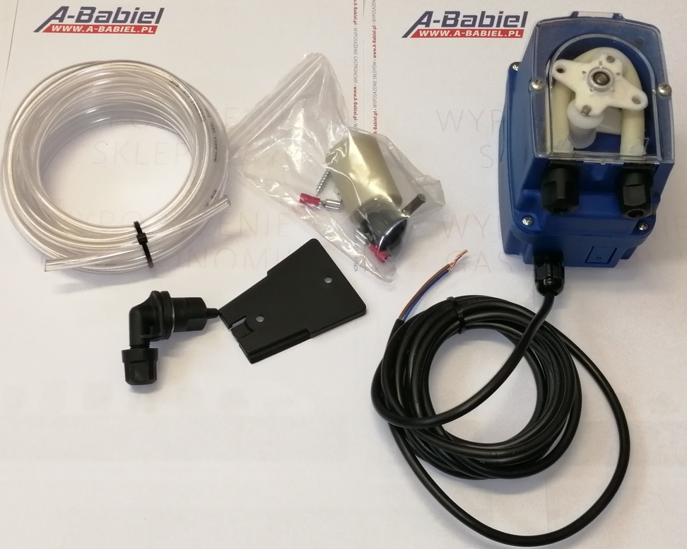 W skład zestawu wchodzi pompa dozująca elektryczna moc 5,5W, wężyk z tworzywa odporny na działanie płynów o odczynie zasadowym, obciążnik, filtr ssący, siatkowy.