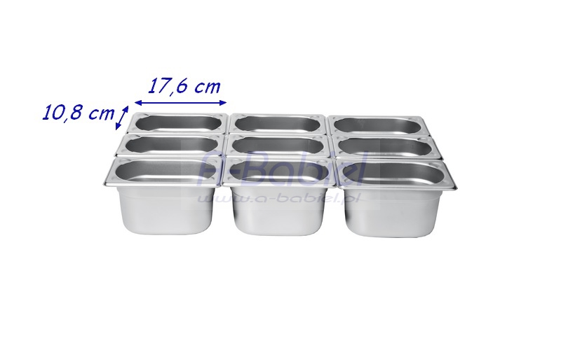 Pojemnik GN 1/9 stalowy to pojemnik gastronomiczny wykonany ze stali nierdzewnej przystosowany do przygotowywania i przechowywania żywności w stołówkach, restauracjach czy barach. Każdy pojemnik GN wykonany jest zgodnie z normami gastronomicznymi PN-EN 631-1:1996 oraz PN-EN 631-2:2000. Solidna konstrukcja i wzmacniane rogi pozwalają stosować pojemnik GN zarówno w niskich jak i wysokich temperaturach. Mogą być stosowane w piecach konwekcyjnych, wyparzarkach, chłodniach czy mroźniach.